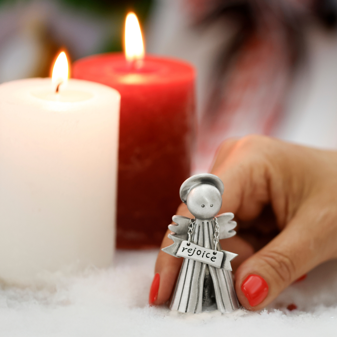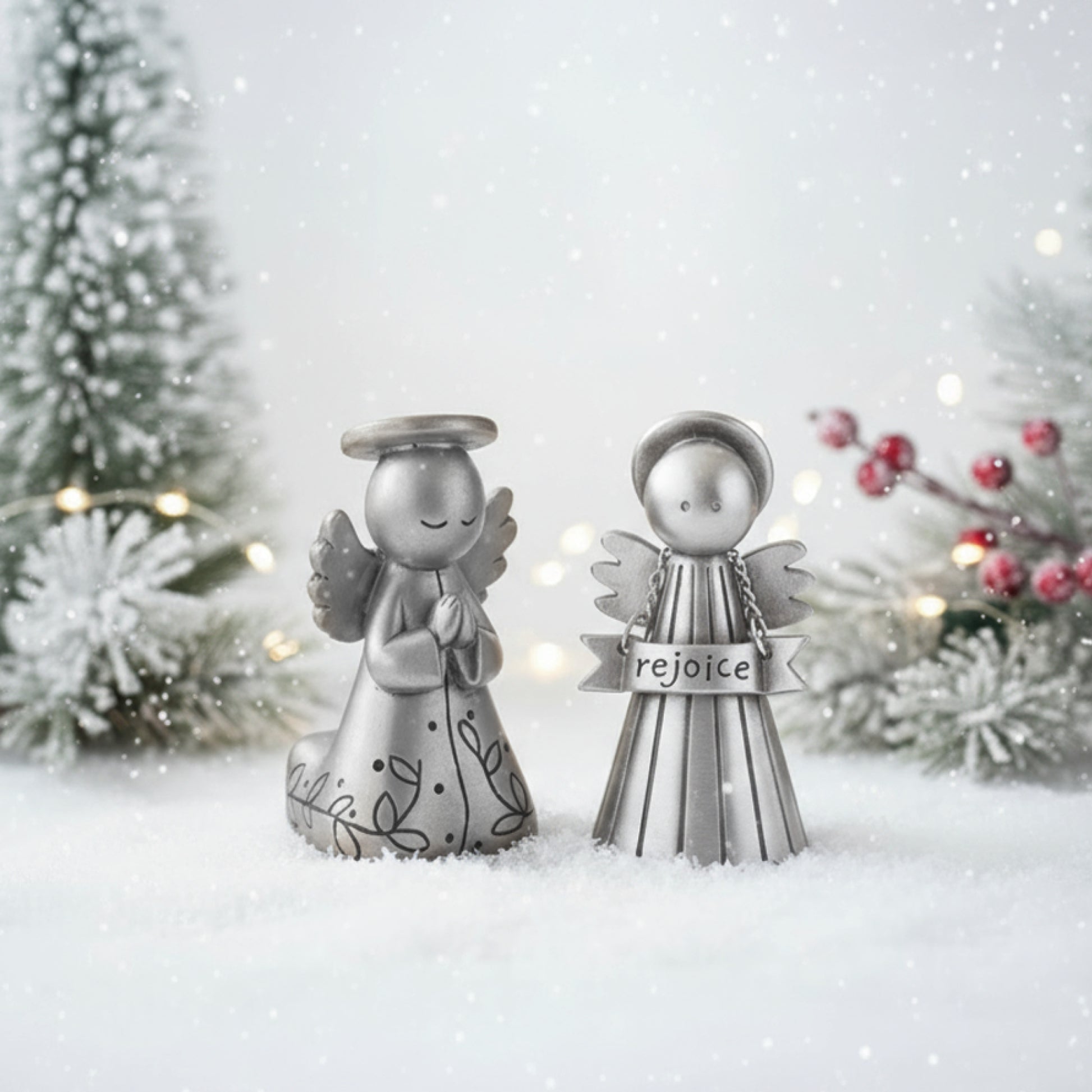 This sweet bundle tells the story of Christmas through two angels. One lifts her banner high, announcing with joy that Christ is born. The other kneels in prayer, quietly bringing our hearts before God. Display them beside your nativity set or keep them near as a daily reminder of faith, love, and the wonder of the season.