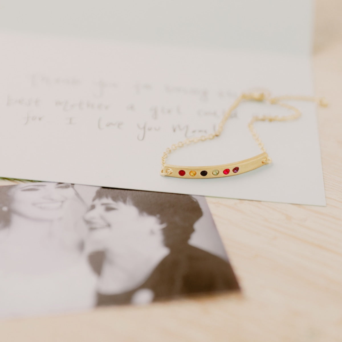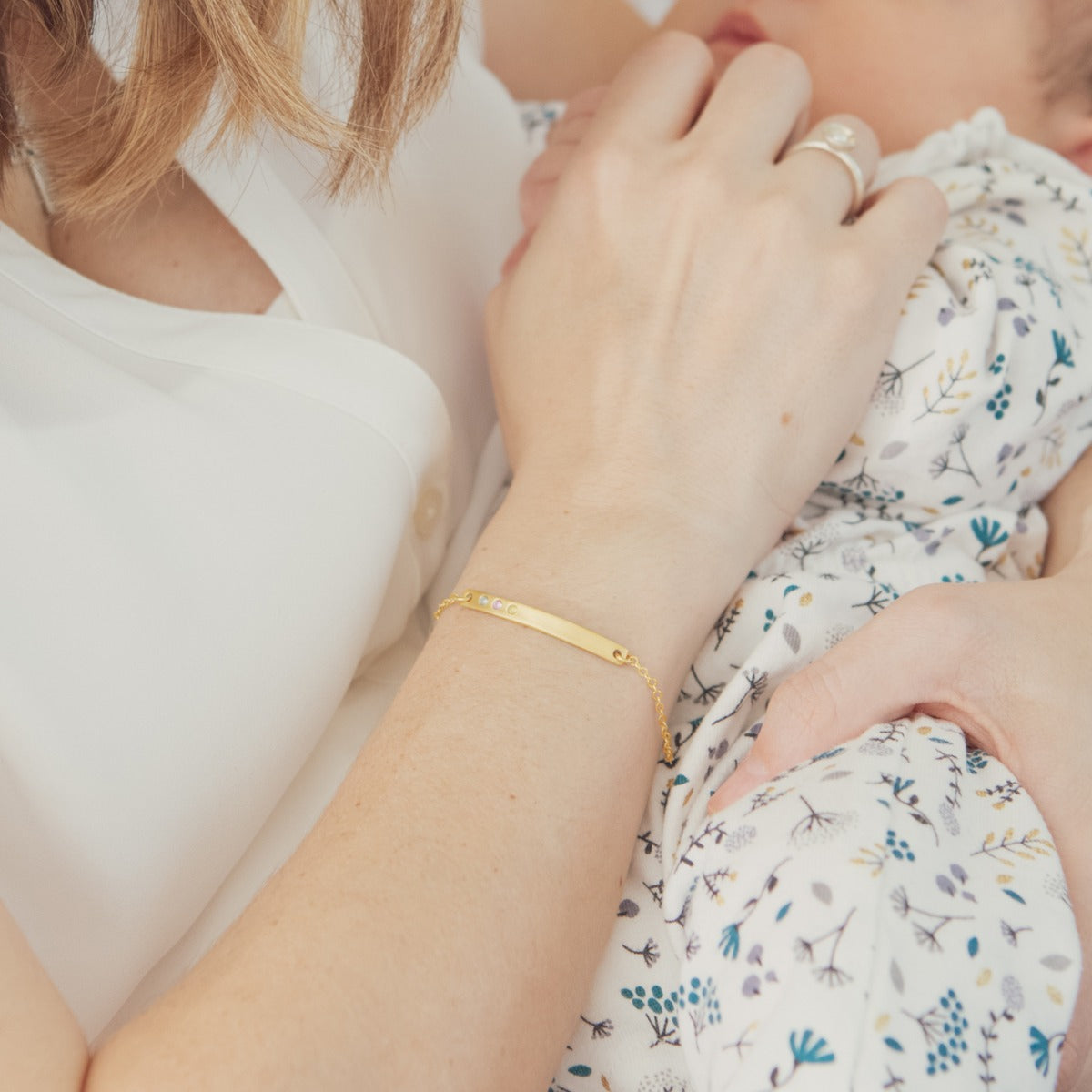 This gorgeous bracelet is hand-crafted in 10k yellow gold and hand-set with up to 7 stones just for you {2mm birthstones or a lab grown diamond}. The bar measures 1 1/2" / 3.8cm across and hangs from a gold-filled link chain. The bracelet measures approximately 8" / 20.3cm in length and is adjustable to 7" / 17.8cm.