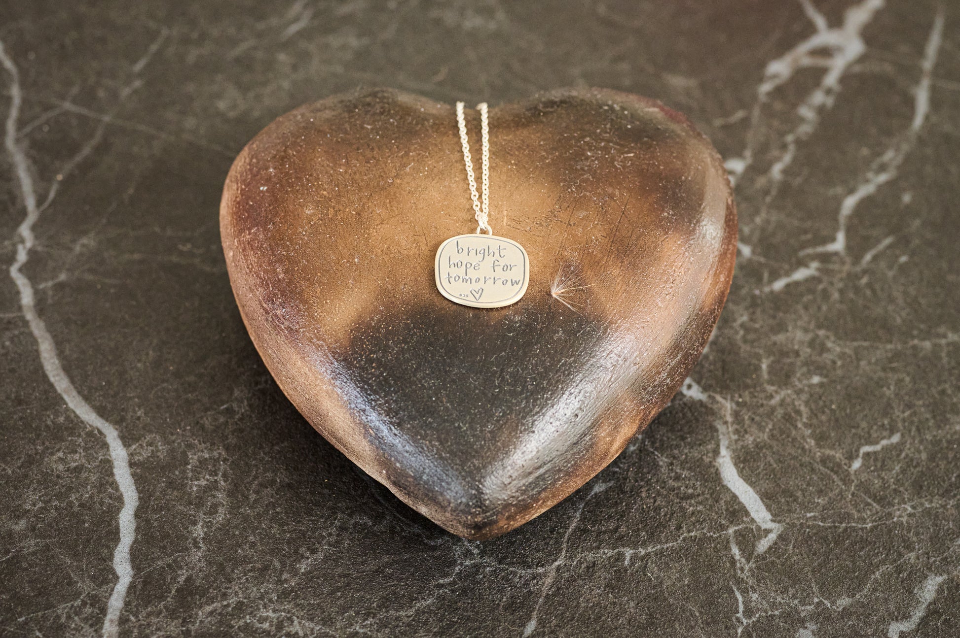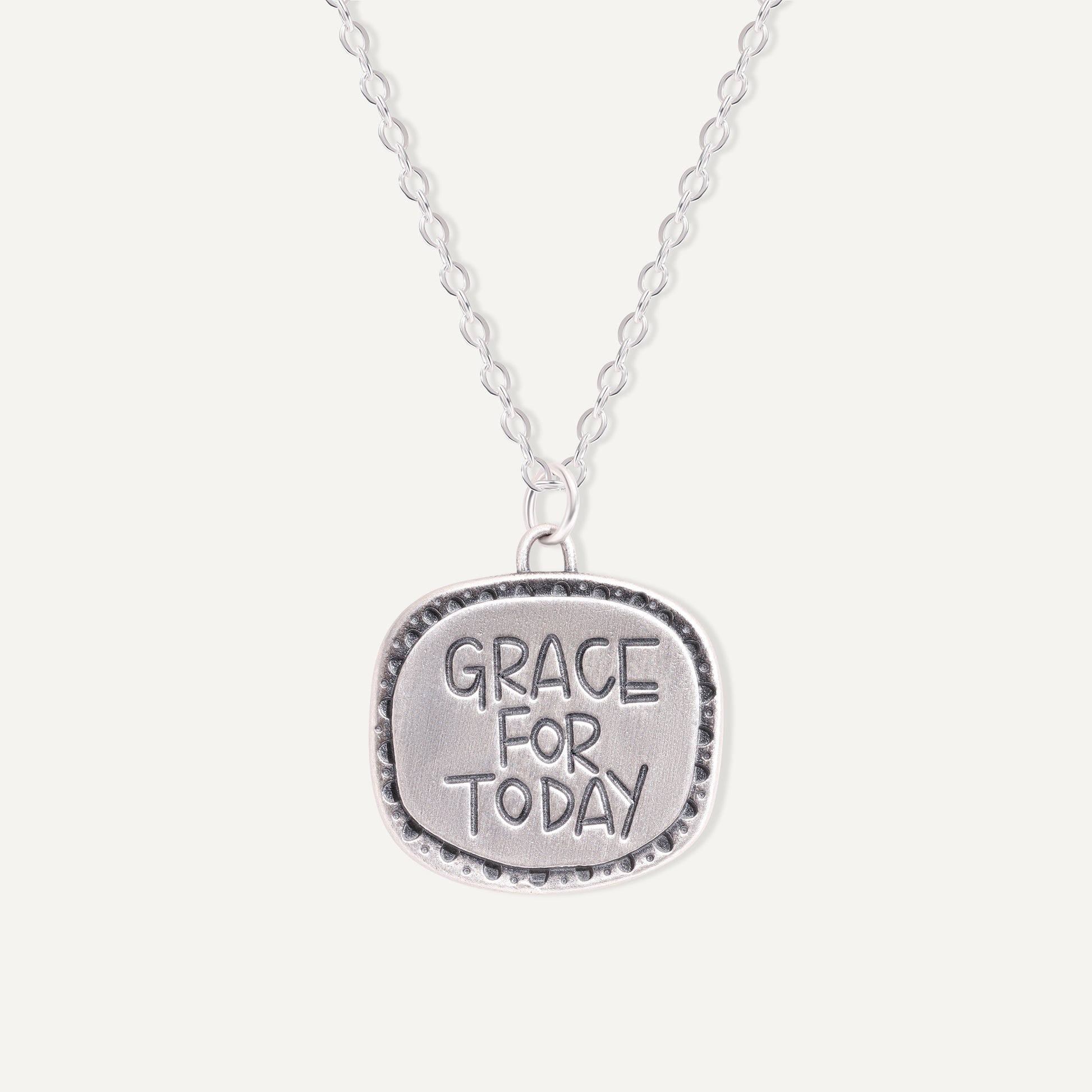 The Grace and Hope Necklace is cast in sterling silver, measures 3/4" / 1.9 cm tall and just under 1" / 2.5 cm wide, and hangs from a sterling silver link chain.