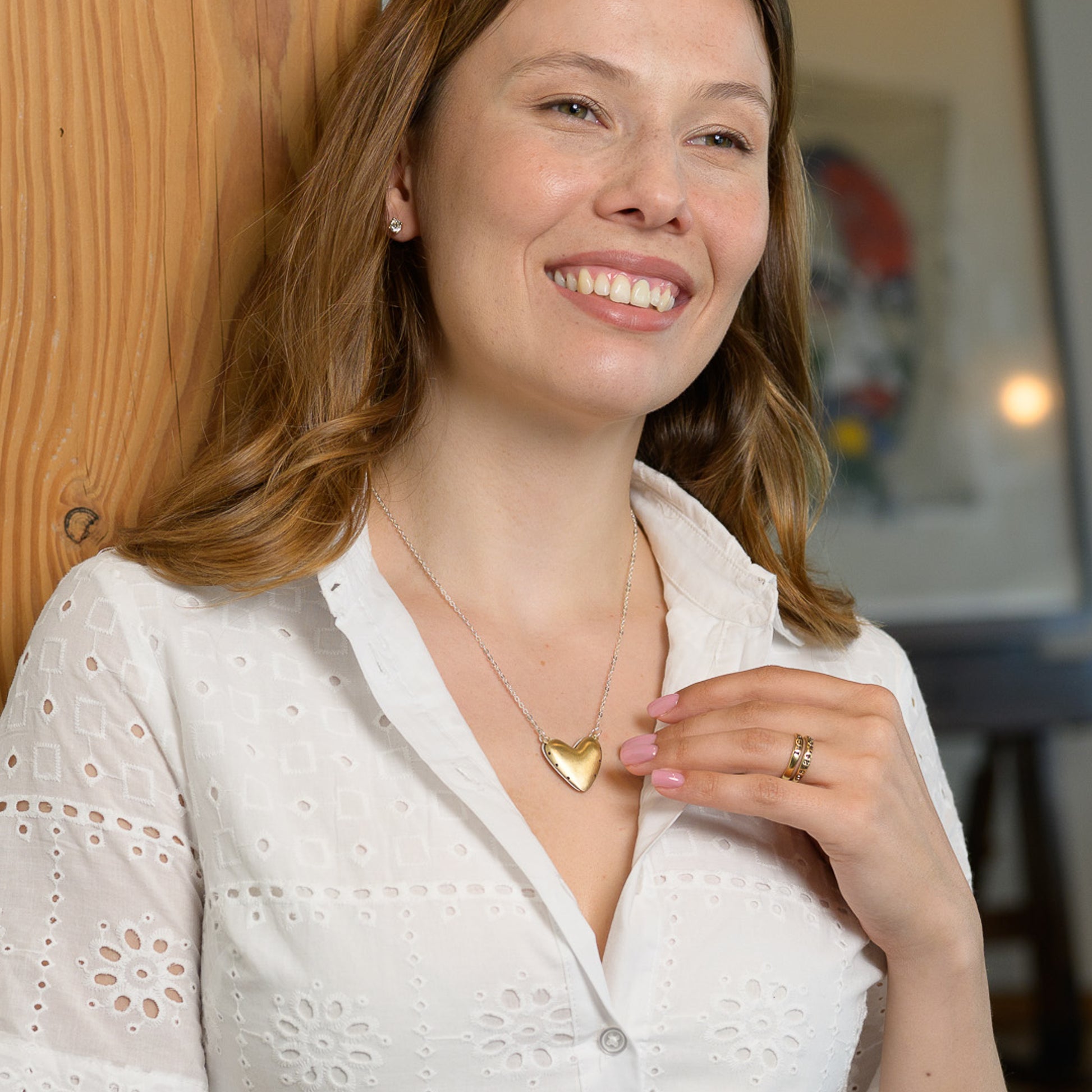 This amazing necklace is made of sterling silver, with one half plated in gold and the other half in silver. The necklace hangs from a sterling silver link chain. To specify a heart, please enter <3 in the customization field.
