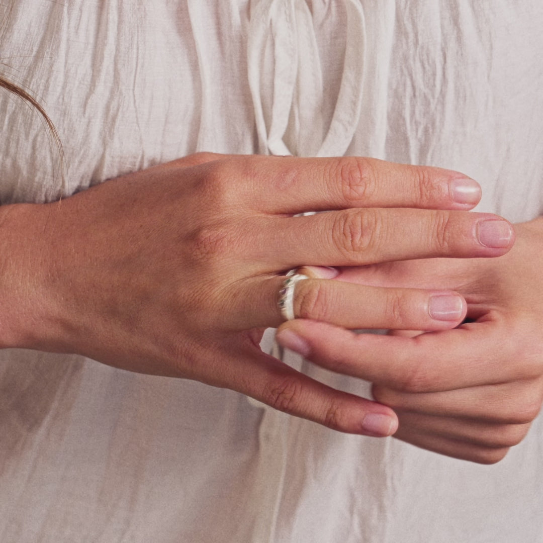 Turquoise represents peace and protection. Its vibrant color is a reminder that there is beauty around us. Things will become clearer as they unfold. There is grace for this moment—we can live with light hearts. Stack multiple turquoise rings together or pair them with our finespun rings! Real turquoise is a natural stone— each is completely unique! So it's normal to see variations in color with some natural markings. Stunning!