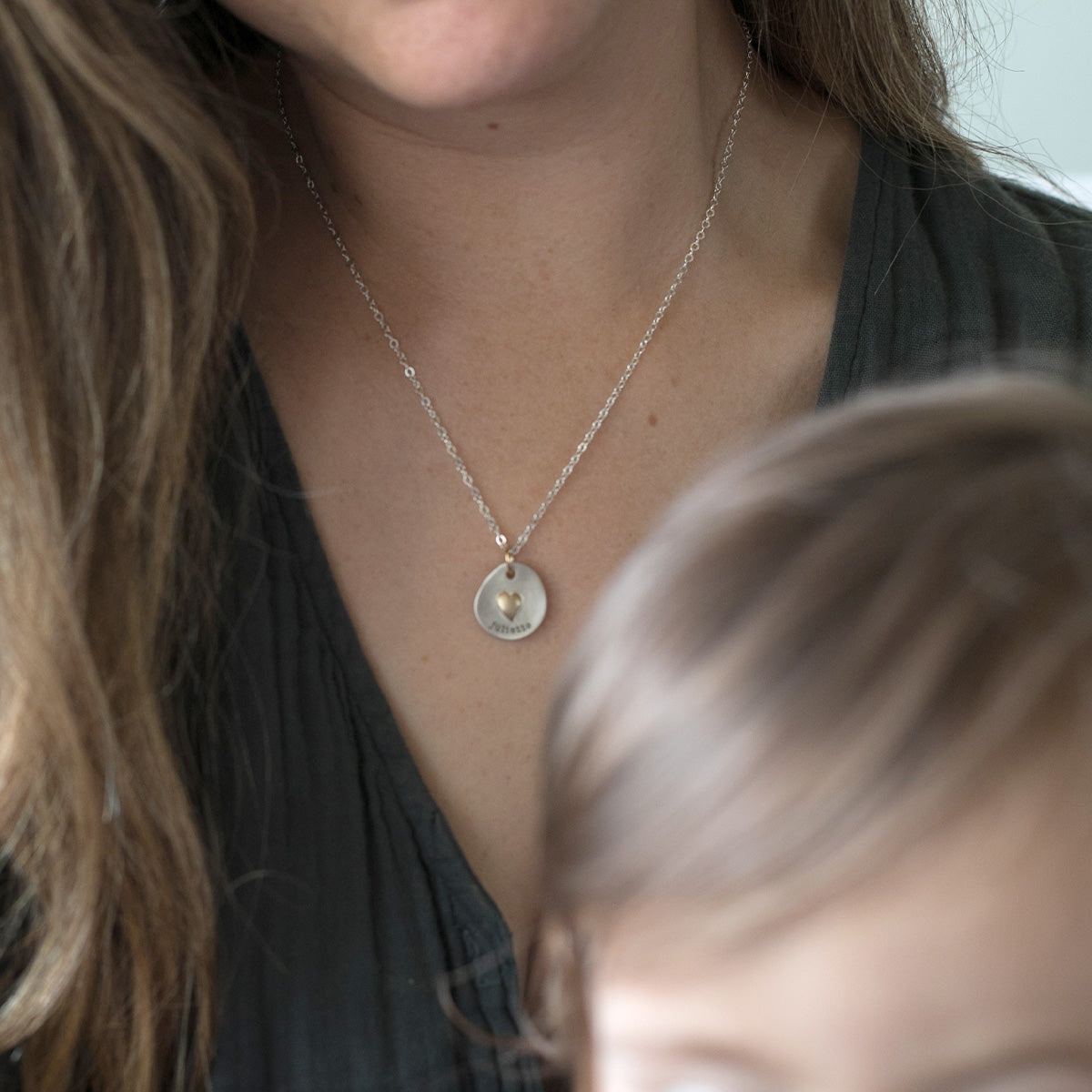 A 14k gold heart is layered over a sterling pendant and engraved with your special name or date. The sterling silver pendant measures 3/4" / 2 cm and is finished with a 14k gold heart on an 18" / 45.7 cm sterling silver chain; engraved.