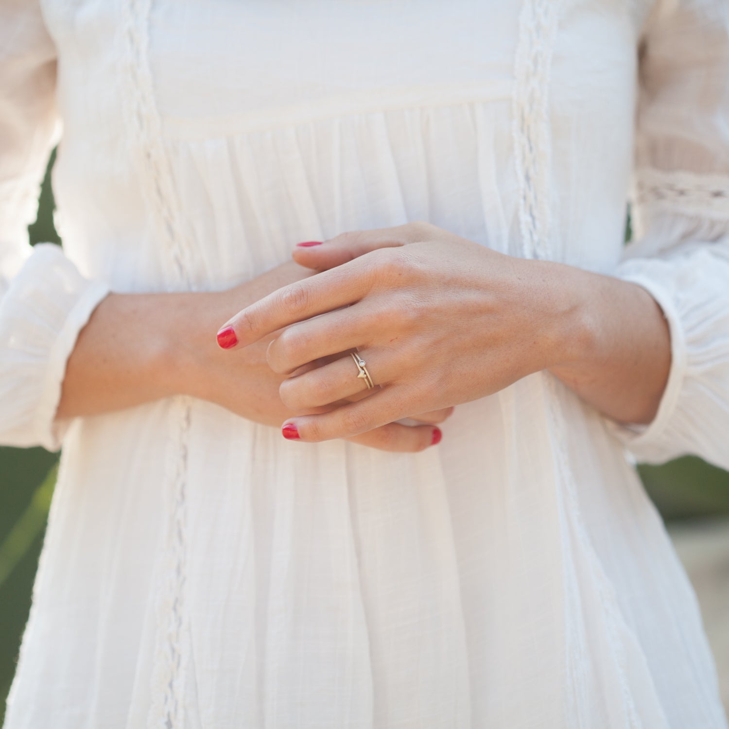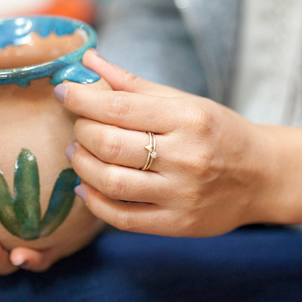 Love makes our hearts whole, loss leaves an emptiness. Somehow we hold these opposing things together. The joy of love, the pain of loss coincide in our hearts. We wouldn't change it--this beautiful paradox. It makes us better and braver and more tender. Wear this delicate, dainty ring duo to represent an angel in your life. This daily reminder keeps them close to your heart. Want to add more Finespun Birthstone rings? Want to add more Sweet Love rings?