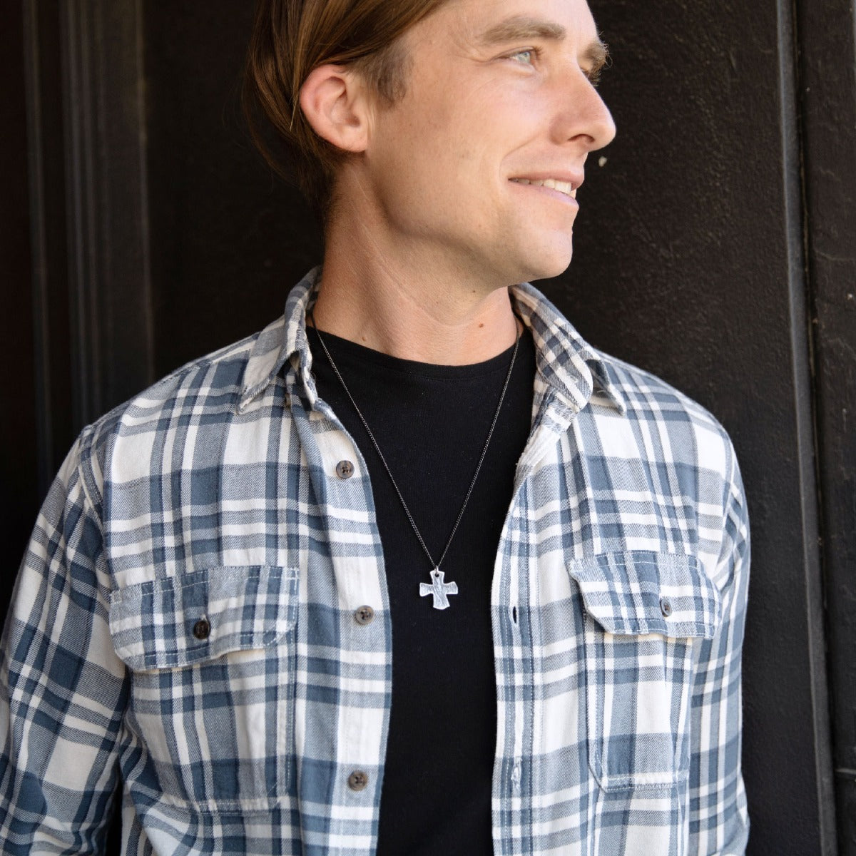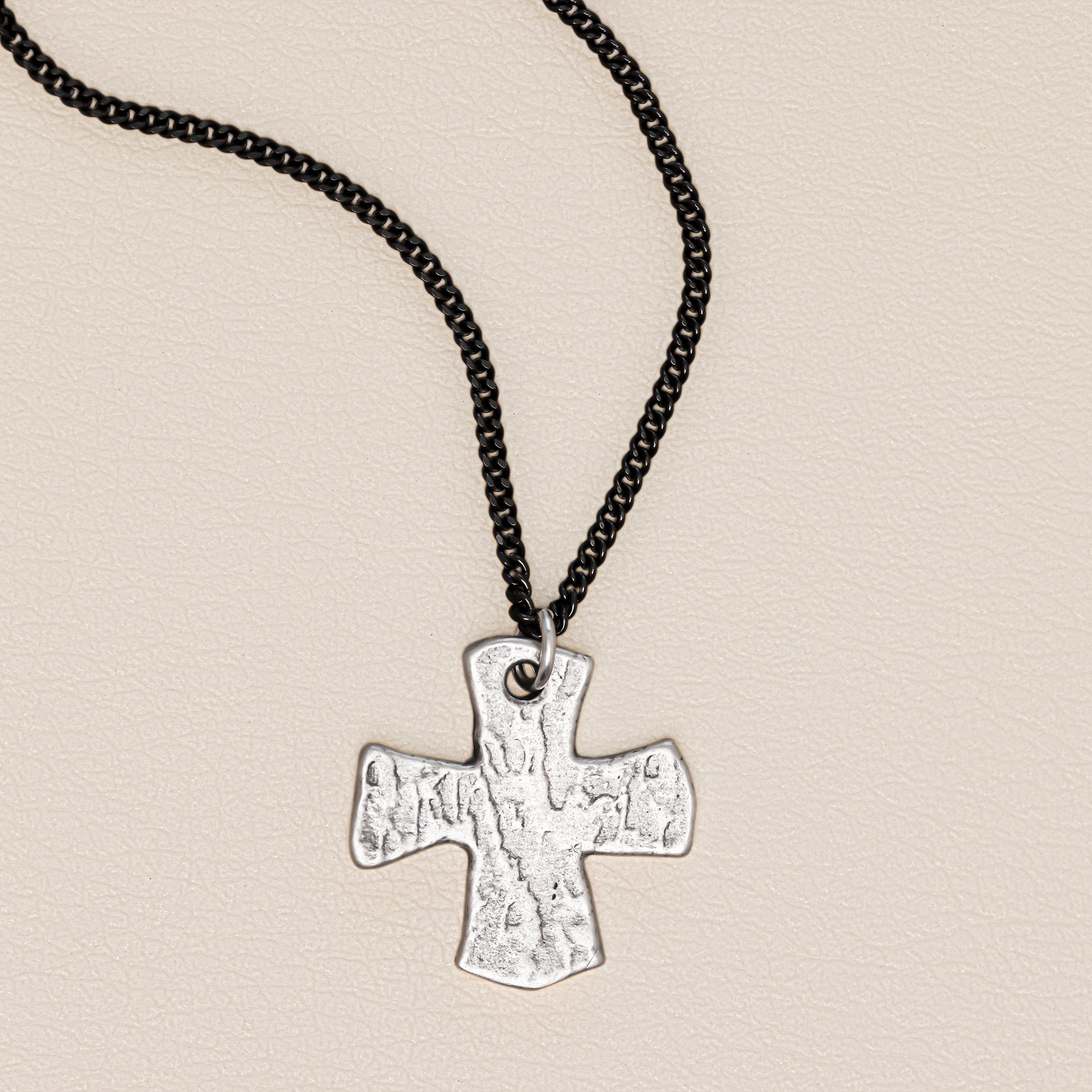 This cross necklace is handcrafted in textured, antiqued sterling silver with the pendant strung on your choice of chain. The cross measures approximately 1" / 2.5 cm tall and 1" / 2.5 cm wide.
