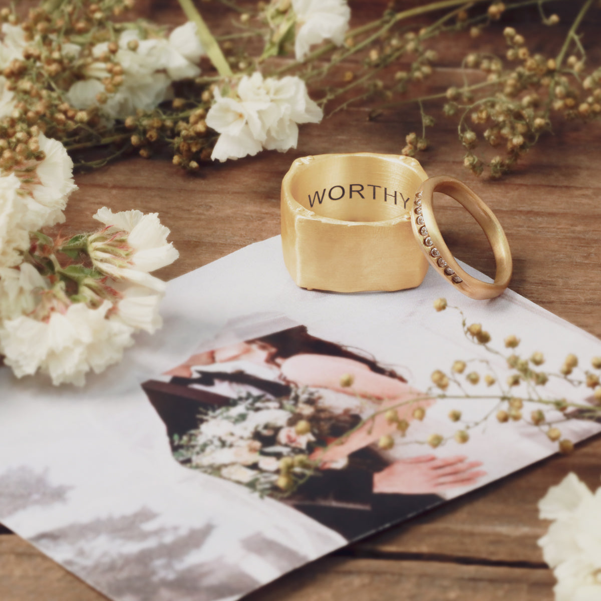 Faithfulness in today's world demands we live Strong + True lives at home, at work and even at play. The four squared sides of this ring represent willingness to live with integrity. The ring is hand carved with rivets in each corner showing the strength a true life requires. Hammered finish for an artisan feel.