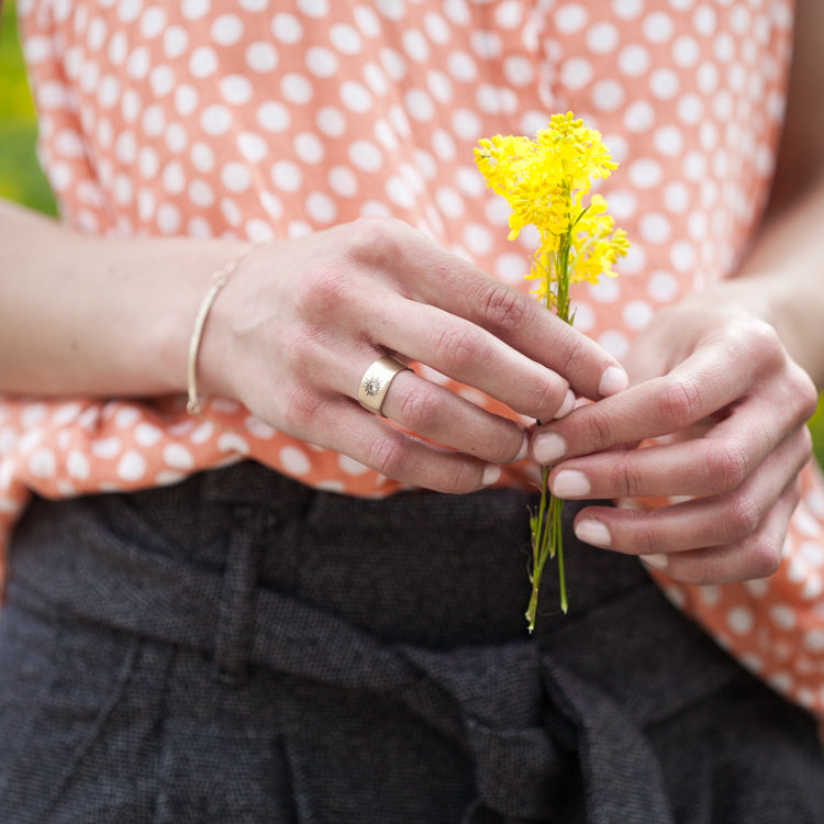 This made to order ring is hand-molded, cast in 9K yellow gold and measures just under 1/2" / 1.27cm tall, with a brushed finish. Set diamond is a lab grown diamonds made even more brilliant with hand-engraving to create a gorgeous sunburst design. Stone measures 3mm in size- choose a diamond or cubic zirconia.