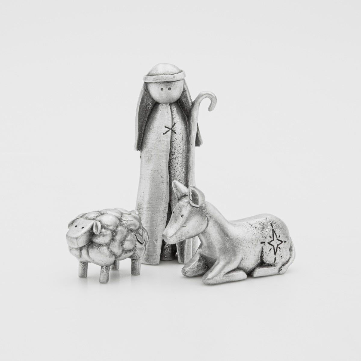 Pewter figures including a shepherd, donkey, and sheep. The shepherd measures just under 3" tall, the donkey measures 3" wide x slightly over 1" tall, and the sheep measures 1/2" wide x 1" long x 1" tall.