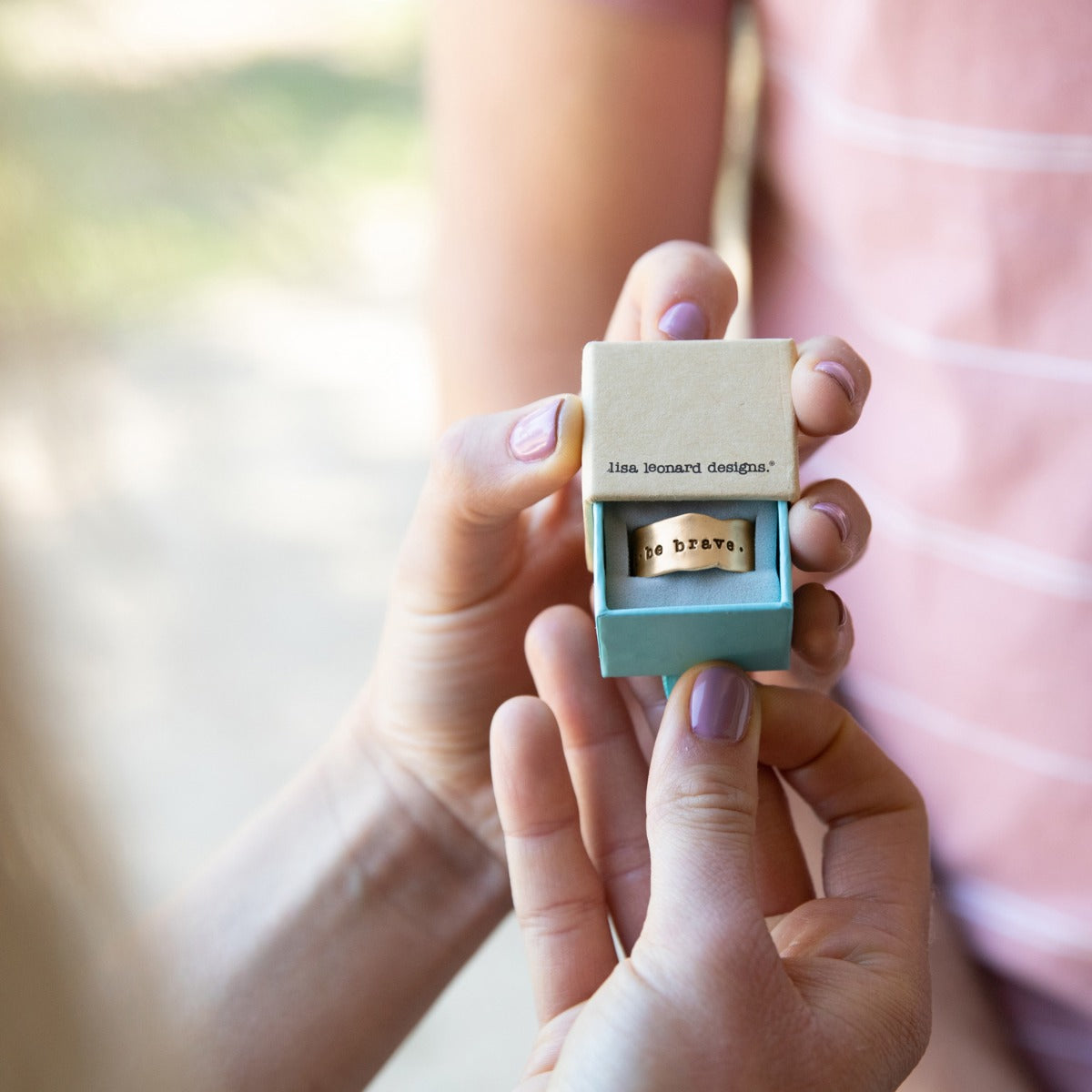 This wide band with an organic, textured edge is a meaningful way to keep your loves close all day long. Stunning in 9k yellow gold with a satin/antiqued finish, this adorable ring measures 3/8" / 9.65cm tall and can be customized with up to 30 characters, lowercase only. To specify a heart, please enter <3