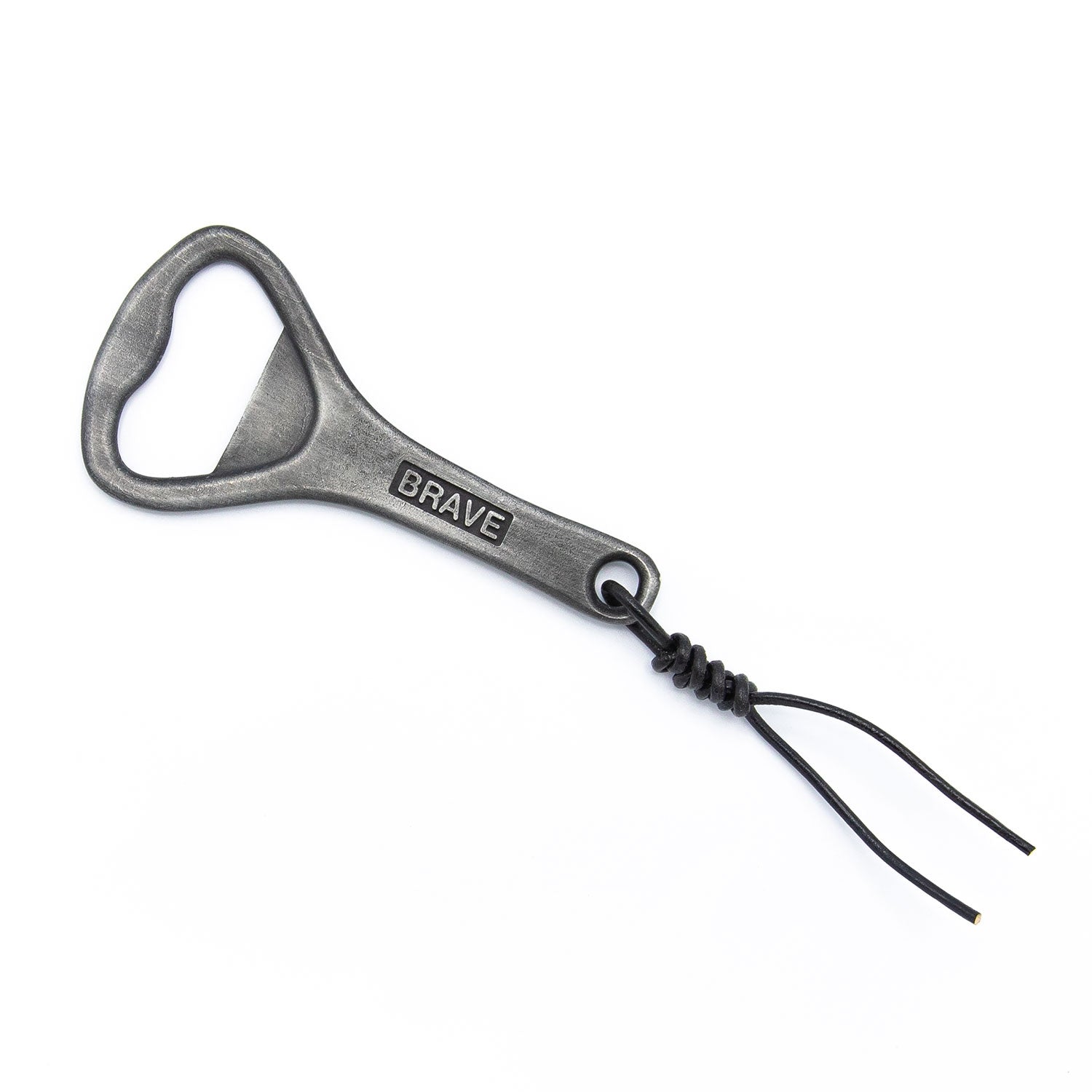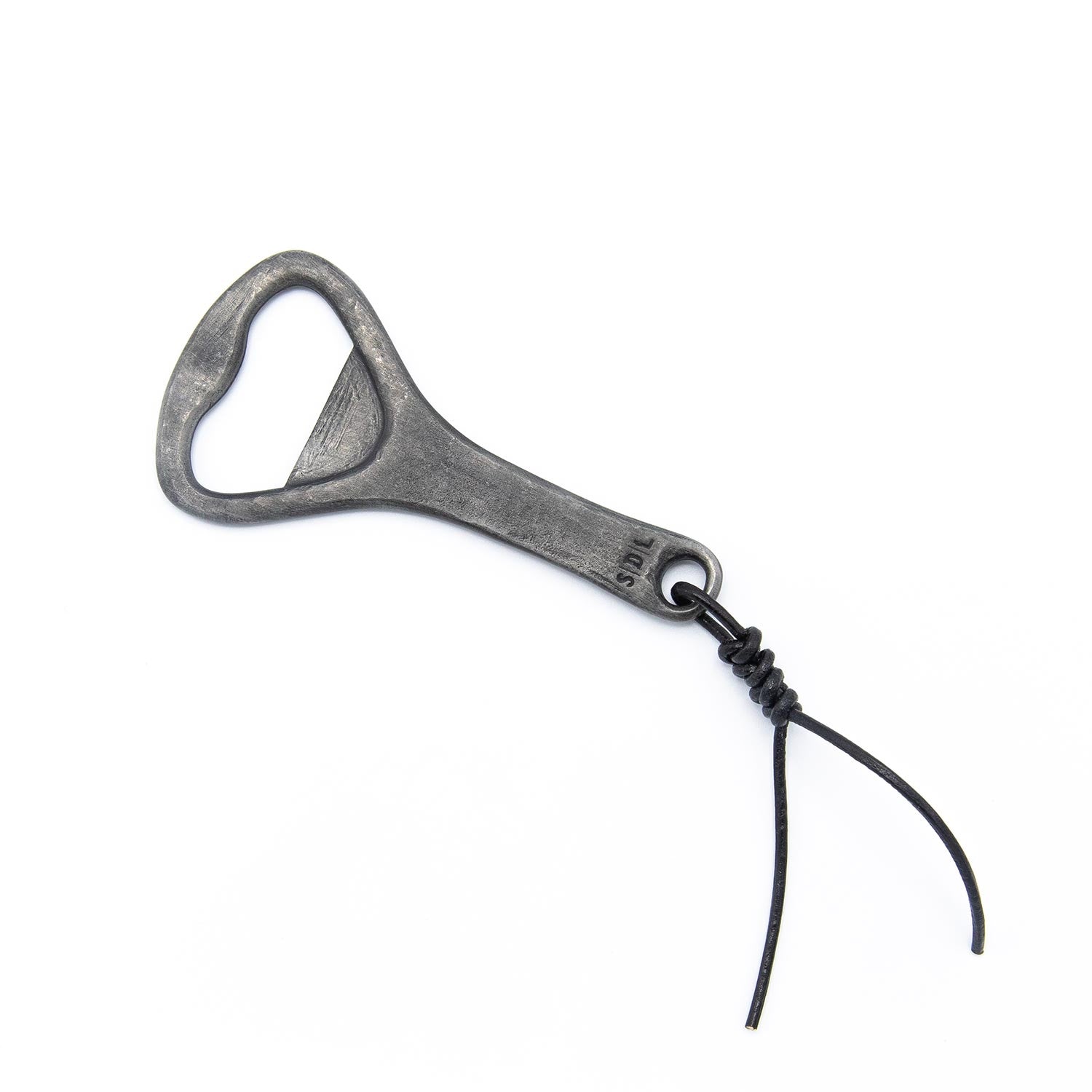 The bottle opener is made of zinc and measures approximately 4" long. A leather cord is attached to it.