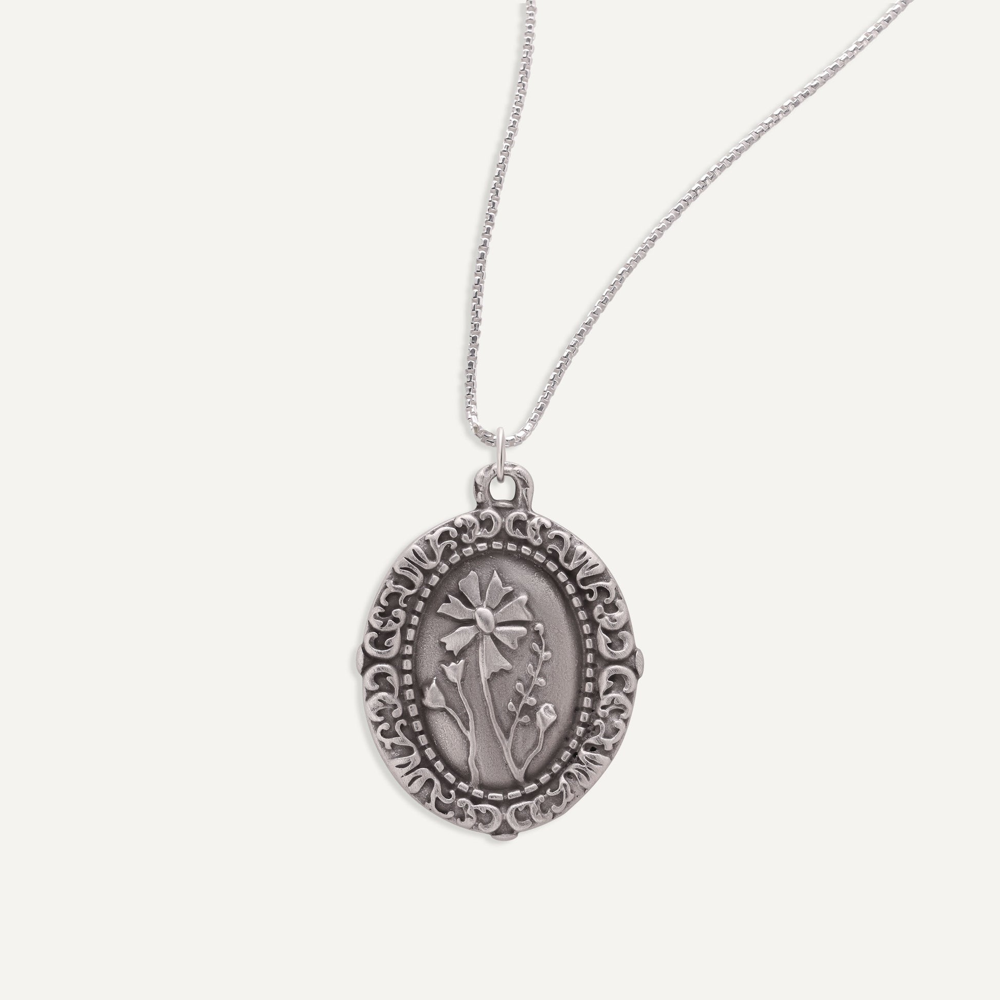 This one is handcrafted with a slightly modern vibe but still full of vintage goodness. This pewter vintage cameo necklace is engraved with sweet florals, measures 1-1/2" H x 1-1/4" W, and strung on a 20" silver-toned link chain.