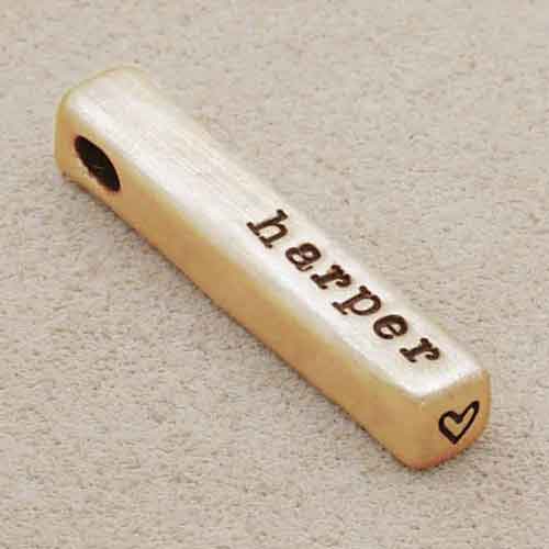 Charm is hand-molded in 14k yellow gold and measures 1 1/4"/3.2 cm tall x 1/4"/0.6 cm wide. As an intentional design decision, we stamp in lowercase letters only. To specify a heart, please enter <3 into the customization field.