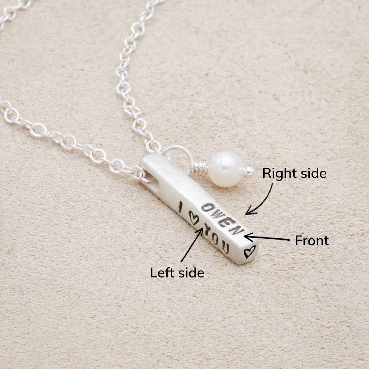 This adorable tiny charm is hand-molded in sterling silver and measures approximately 3/4" / 2 cm tall by 1/8" / 0.3 cm wide. It is engraved with a tiny heart on the bottom, hangs from a sterling silver link chain, and includes a freshwater pearl. To specify a heart, please enter <3 into the customization field.