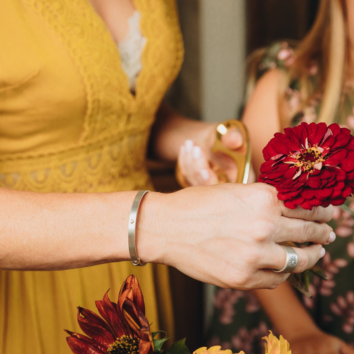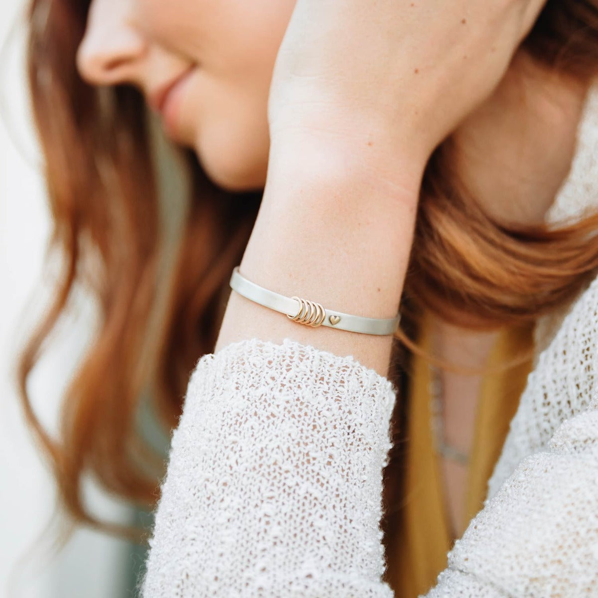 Your love is wrapped around my heart like a thick, cozy blanket. Cuff is hand-crafted and finished with a gold heart and gold rings. Add a gold-filled ring for each of your loves. Stunning in sterling silver with a matte brushed finish, this sweet cuff is 6" / 15.2cm long and 2.5" / 6.4cm in diameter with a 1" / 2.5cm opening. Add up to 7 gorgeous gold-filled ring charms for each of your loves!
